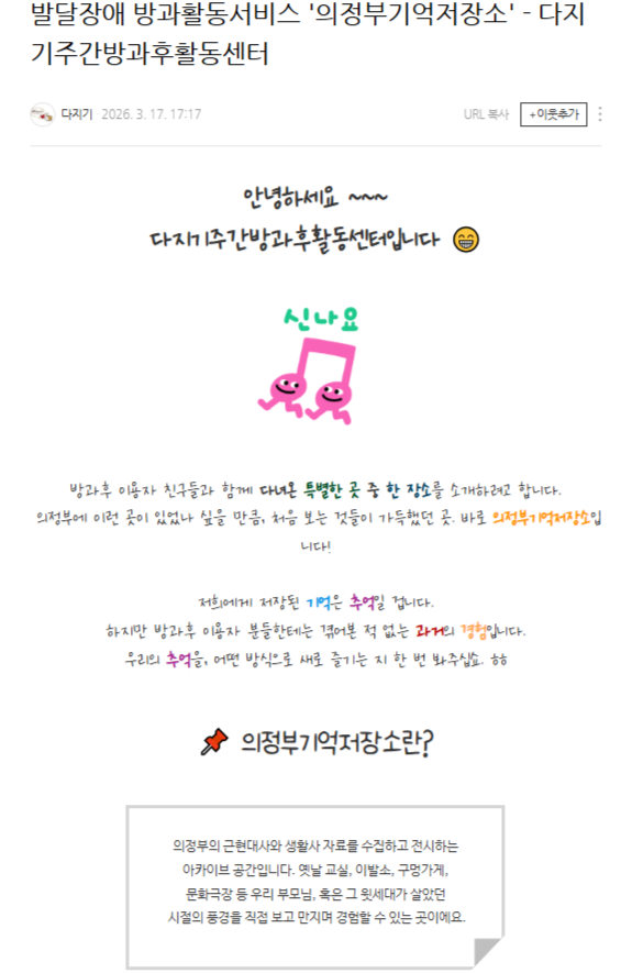 블로그 바로가기 : 발달장애 방과활동서비스 '의정부기억저장소' -.. : 네이버블로그